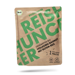 Keine Lust auf billigen Express Reis, aber auch keine Muße und Zeit vorzukochen? Du brauchst nur 2 Minuten, um leckeren und frischen Reis zuzubereiten. Bereits schonend gedämpft braucht unser Bio Vollkorn Basmati mit Rotem Reis nur wenige Drehungen in der Mikrowelle oder in der Pfanne. Du kannst deinen Reishunger nun direkt pur stillen oder eine leckere Sauce dazu kombinieren.