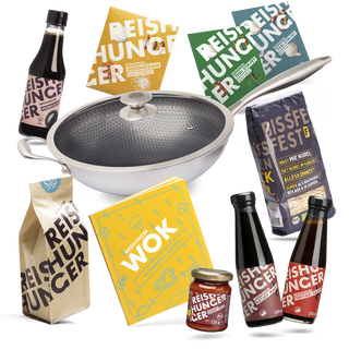 Dann ist unser Premium Edelstahl Wok mit innovativer Antihaftbeschichtung der ideale Einstieg. Das ofenfeste Küchenwunder ist nicht irgendeine kugelige Pfanne – ihn ihm brutzelt und schmort es sich auf jedem Herd besonders gut. Aber da fehlt doch noch was … na klar! Neben duftendem Basmati Reis und Mie Nudeln als Basis sowie einer Auswahl aromatischer Pasten und Saucen zum Abschmecken findest du in unserem Starter Set das ideale Kochbuch mit 25 authentischen Rezepten rund um die Welt des Wok.