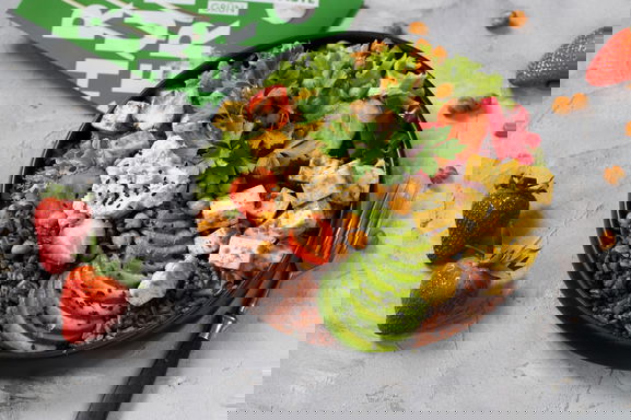 Voll im Trend liegen bunte Bowls, mit vielen nahrhaften Zutaten. Zum Beispiel prall gefüllt mit Tomaten, Tofu, Gurken, Blumenkohl, Kichererbsen, rotem Reis, Erdbeeren für eine fruchtig leichte Note und Avocado als Lieferant für die Portion gesunder Fette.