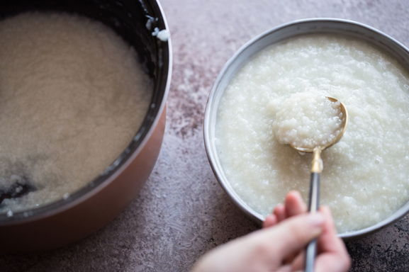 Bei der Zubereitung von Reisbrei ist was Reis-Wasser-Verhältnis sehr wichtig. Während bei der normalen Zubereitung weißer Reissorten meistens ein Reis-Wasser-Verhältnis von 1:1,5 reicht, liegt dieses beim Kochen von Reisbrei um einiges höher. Für die Zubereitung von Reis Congee wird ein Teil Reis mit bis zu zwölf Teilen Brühe oder Wasser aufgekocht.
