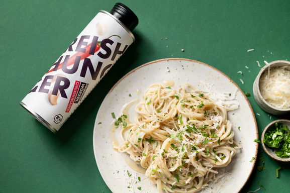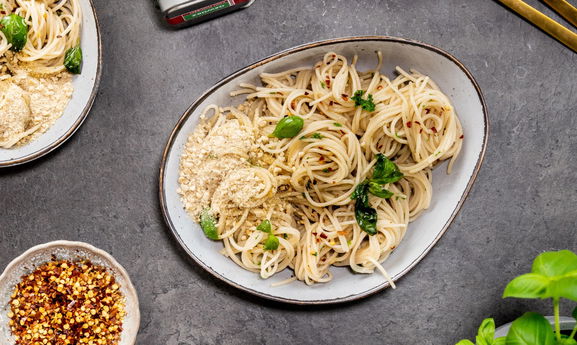 Wir lieben unsere Pasta natürlich aus Reis! Unsere Reispasta kannst du super in der Mikrowelle zubereiten. Dafür einfach die Reispasta Spaghetti in der Mikrowelle zubereiten und dabei etwa 60 ml Kochwasser auffangen und beiseitestellen. Während die Pasta gart, die Petersilie fein hacken. In einer Pfanne etwas Würzöl Chili-Knoblauch erhitzen, die al dente gekochten Spaghetti hineingeben und kurz schwenken. Anschließend das Kochwasser und die gehackte Petersilie hinzufügen, mit Salz und Pfeffer abschmecken und alles gut vermengen. Zum Schluss auf Tellern anrichten und mit Parmesan oder Parmesan Alternative bestreuen – fertig ist dein einfaches, aber unglaublich leckeres Pastagericht!