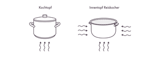 Beim Kochen mit einem Kochtopf ist die Wärmequelle die Herdplatte, auf der dieser steht. Egal ob Elektroherd, Induktion oder Gasherd: die Hitze befindet sich immer unter dem Topf. Dieser wird einseitig von unten erhitzt und die Wärme kann an allen Seiten wieder entweichen. Ein herkömmlicher Topf benötigt somit eine hohe Wärmezufuhr. Unsere Digitalen Reiskocher hingegen ist mit einem 3D-Heating System ausgestattet. Dieses sorgt dafür, dass der Innentopf gleichmäßig warm wird und der Reis gleichmäßig gegart wird. Dank Thermoskannen-Effekt bleibt die Wärme außerdem lange erhalten. Durch die Wärmeregulierung muss der Multifunktionskocher nach dem Einschalten nicht mehr zum Umrühren geöffnet werden, wodurch Energie eingespart wird und ganz entspannt andere Dinge erledigt werden können.. Noch ein Pluspunkt: Der Premium-Innentopf unserer Digitalen Reiskocher ist so aufgebaut, dass er die Hitze gleichmäßig verteilt. Wie das funktioniert? Mithilfe einer zweifachen Antihaftbeschichtung aus Keramik, einer 2 mm dicken Aluminiumlegierung und einer hitzebeständigen Außenschicht.