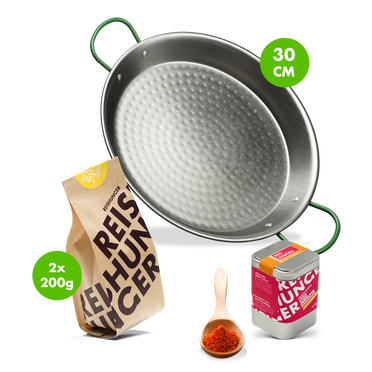 Für die Zubereitung von Paella werden spezielle Paella Pfannen genutzt, die kleine Mulden am Boden haben. Hier sammelt sich das Öl, sodass der Paella Reis nicht anbrennt. Nachdem du dein liebstes Gemüse in der Pfanne angebraten hast, wird der Reis in der Pfanne angeschwitzt und mit abgelöscht. Wichtig hierbei ist eine würzige Gemüsebrühe – das Albufera Korn nimmt den Geschmack nämlich besonders gut auf. Nach dem Ablöschen solltest du in der Pfanne nicht mehr Rühren, damit der Paella Reis nicht matschig wird. Am Ende mit Paella Gewürz verfeinern und Reisgericht servieren.