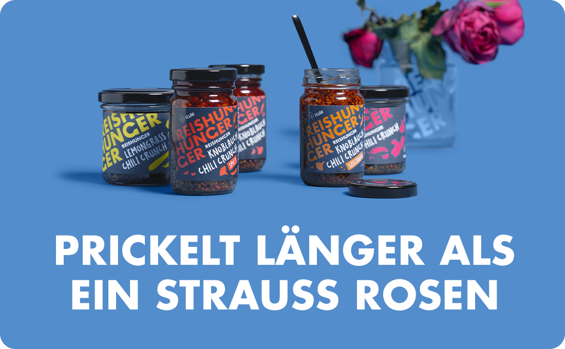 Der Ursprung des Chili Crunch liegt in der chinesischen Küche – das Chili Crisp findet jedoch auch in abgewandelter Form in der japanischen Küche (auch Rayu genannt) statt. Auch beim Hot Pot und beliebten Korean BBQ macht das knusprige Chili Oil in Dipping Saucen eine richtig gute Figur. Mittlerweile ist das Chili Crisp ein absolutes Trendprodukt und darf als würziges Topping in keiner Küche fehlen.