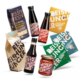 Wir finden: dieses Set ist einfach der Wahnsinn. Denn hui ist das vollgepackt mit Produkten, die in deinen Wok Gerichten nie wieder fehlen dürfen. Da merkt man, dass wir von Reishunger schon die ein oder andere Wok Pfanne geschwungen haben und hier und da ein herrliches Stir-Fry Gericht auf dem Teller landet.