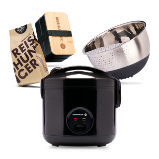 Neben unserem Basis Reiskocher findest du in unserer Black Box praktisches Zubehör und sogar Reis in zeitlosem Schwarz. Perfekt, um dir den Reisgenuss zu versüßen.