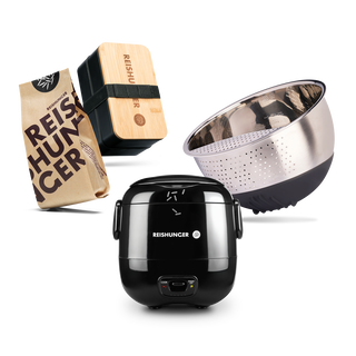 … gibt es unsere Mini Reiskocher Black Box! In ihr versammeln sich 4 Premium Produkt in elegantem Schwarz, die deinen Reisgenuss auf das nächste Level bringen. Die praktische Reis Waschschüssel ist der ideale Ort für ein herrliches Reisbad – perfekt, um unseren bissfesten, intensiv erdigen Schwarzen Bio Reis zu waschen. Unser Mini Reiskocher gart den Reis anschließend auch in der kleinsten Küche und mit der Bento Box bist du auch unterwegs immer perfekt ausgestattet. Das Praktische: Mit dem Set machst du ein echtes Schnäppchen. Wenn das nicht mal die ideale Geschenkidee für deine Liebsten ist.