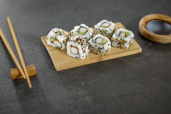California Rolls oder auch Ura Maki werden so gerollt, dass sich das Noriblatt innerhalb und nicht außerhalb der Rolle befindet.