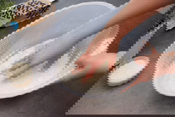 Doe de rijst in een kom en bedek hem met koud water. Bewerk de rijst met jouw handen in cirkelvormige bewegingen. Het teveel aan zetmeel maakt het water troebel. Giet nu het water af en herhaal het proces tot het water helder blijft.