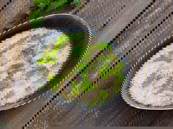 - Was de rijst eerst twee keer en voeg vervolgens 1,5 keer de hoeveelheid water toe om de rijst 10 minuten te laten weken. Zout je rijst naar eigen smaak.